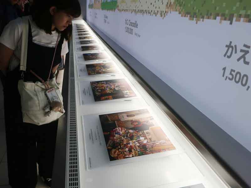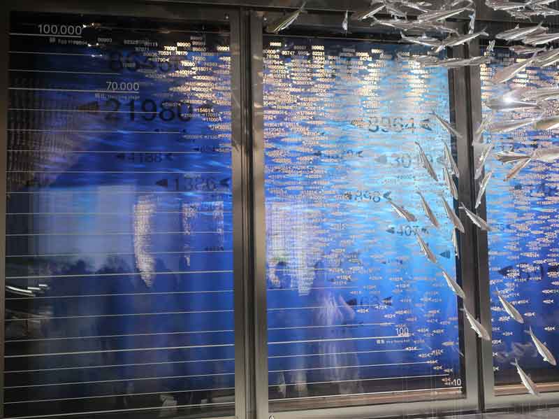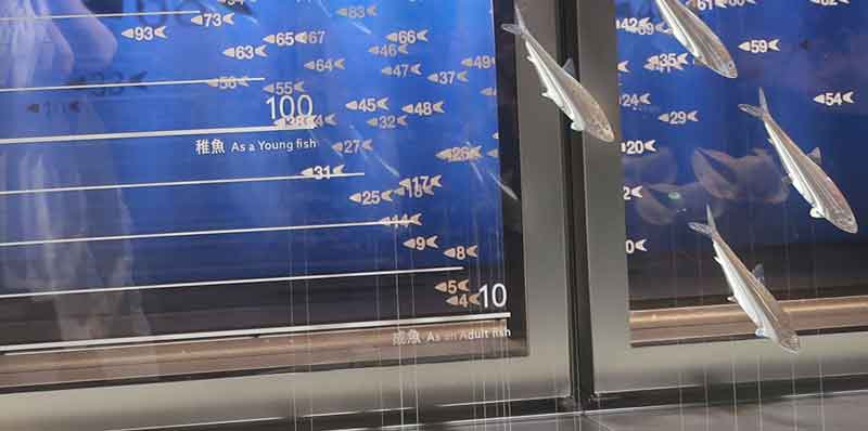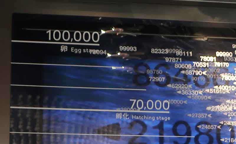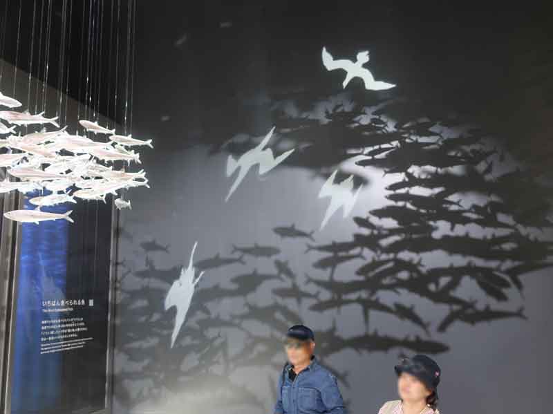 卵から稚魚が孵り、成長魚になり、人間に捕まえられて流通に載り、スーパーに陳列され、家庭の食卓に上がるまでの数量の変遷が展示されています。
