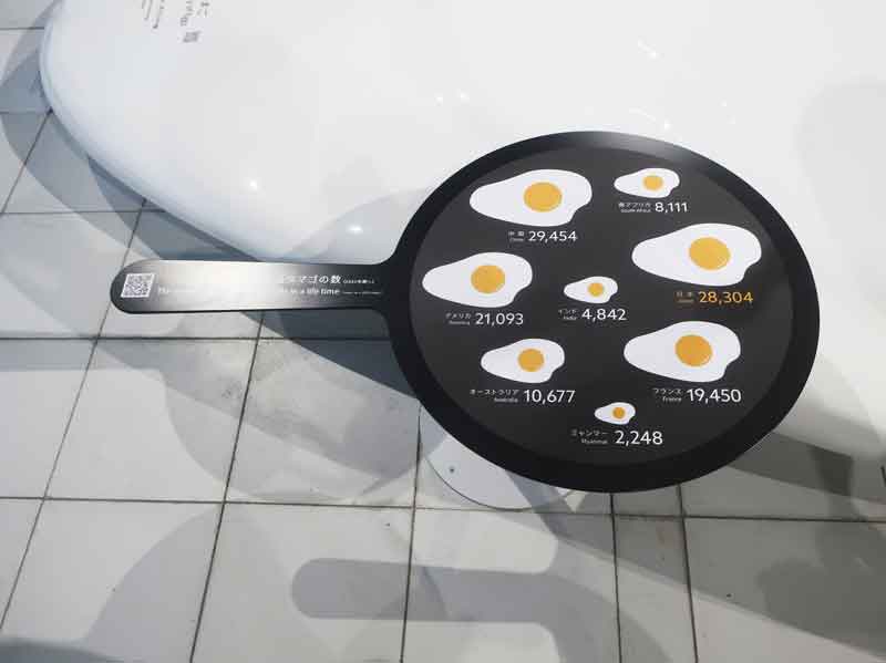 そこのフライパンには、各国の1年間の卵の消費量がディスプレイされていました。