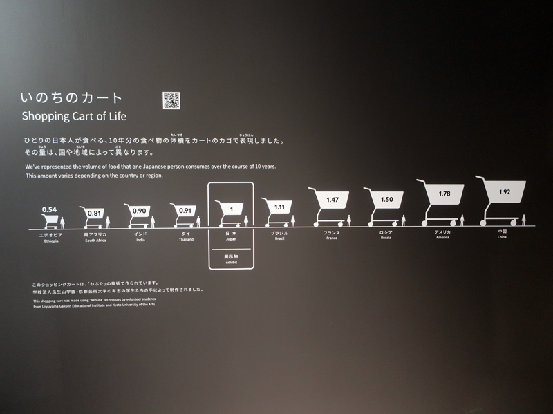 家庭の食量を買い物カゴのディスプレイで表現したように、グラフを立体的なものに展示造作して、分かりやすく表現する。