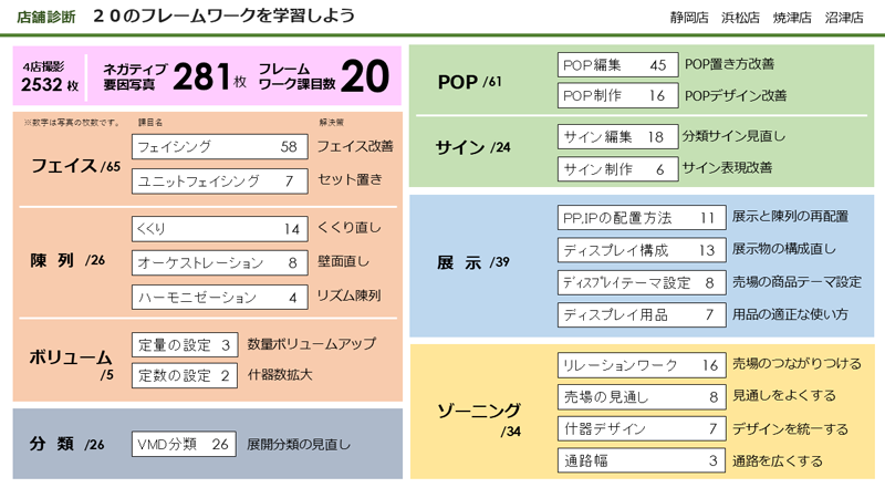 実はこれはスタッフ研修用につくったもので、研修前にスタッフに渡して「これらのフレームワークを今日覚えれば、店舗の悪い個所はすべて直すことができます」ということを表しています。